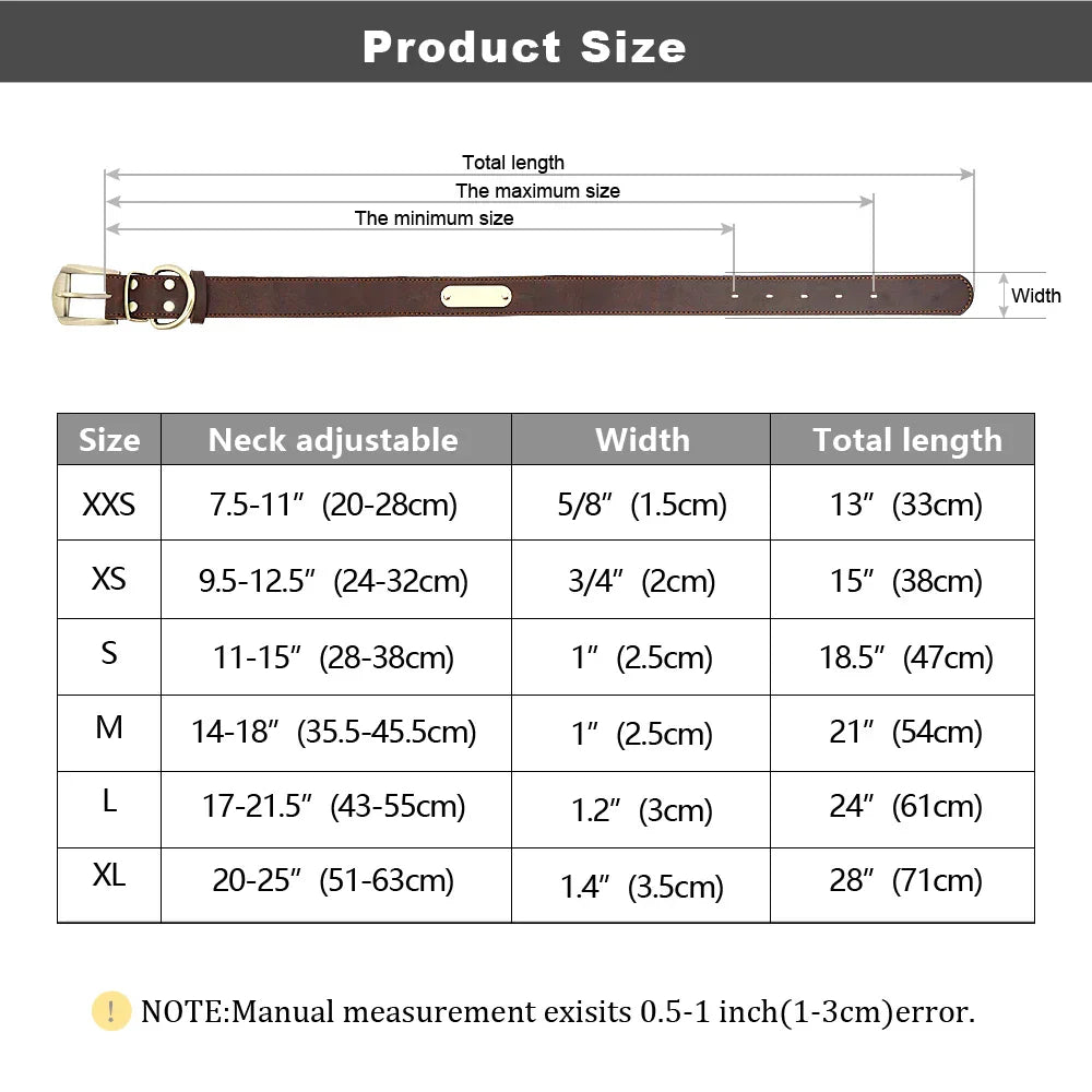 Adjustable leather dog collar with free engraved ID tag. Durable and stylish, suitable for small, medium, and large dogs.